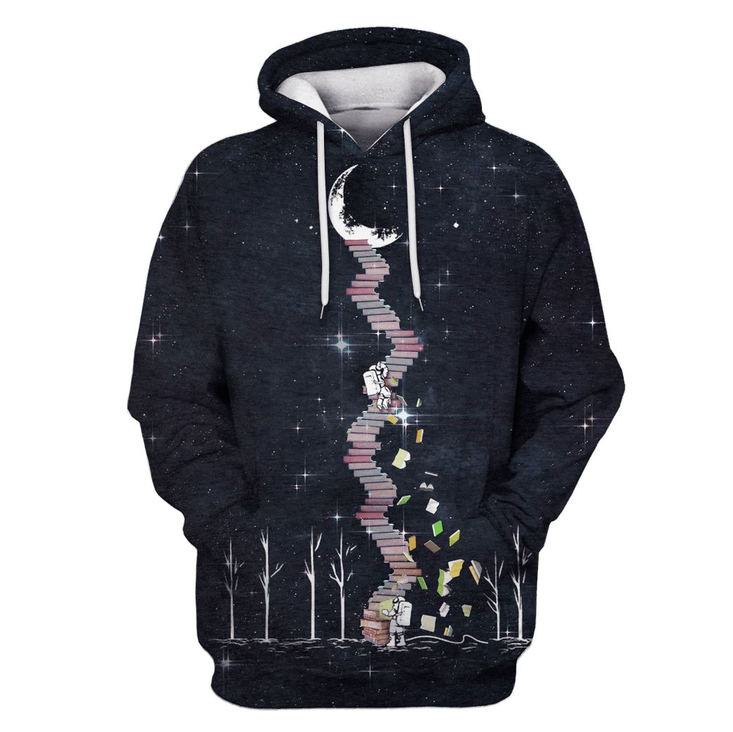 Gearhumans Astronaut Climbing up to the Moon by book stairs Custom T-shirt – Hoodies Apparel