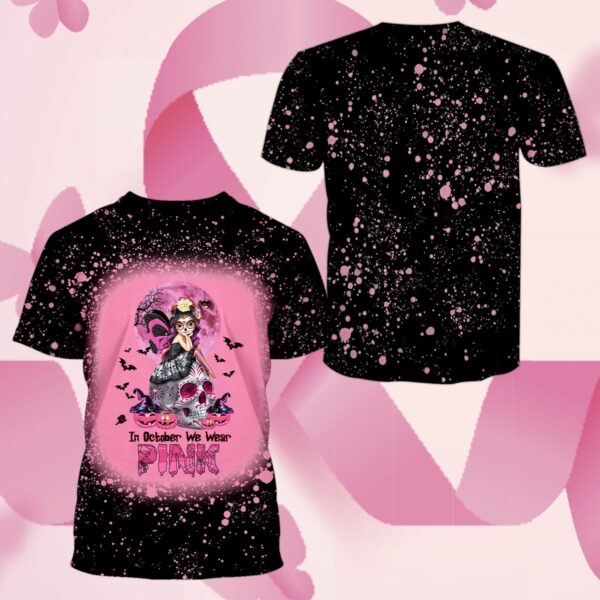 Gearhumans 3D Sugar Skull Girl Breast Cancer Awareness Custom Bleached Shirt
