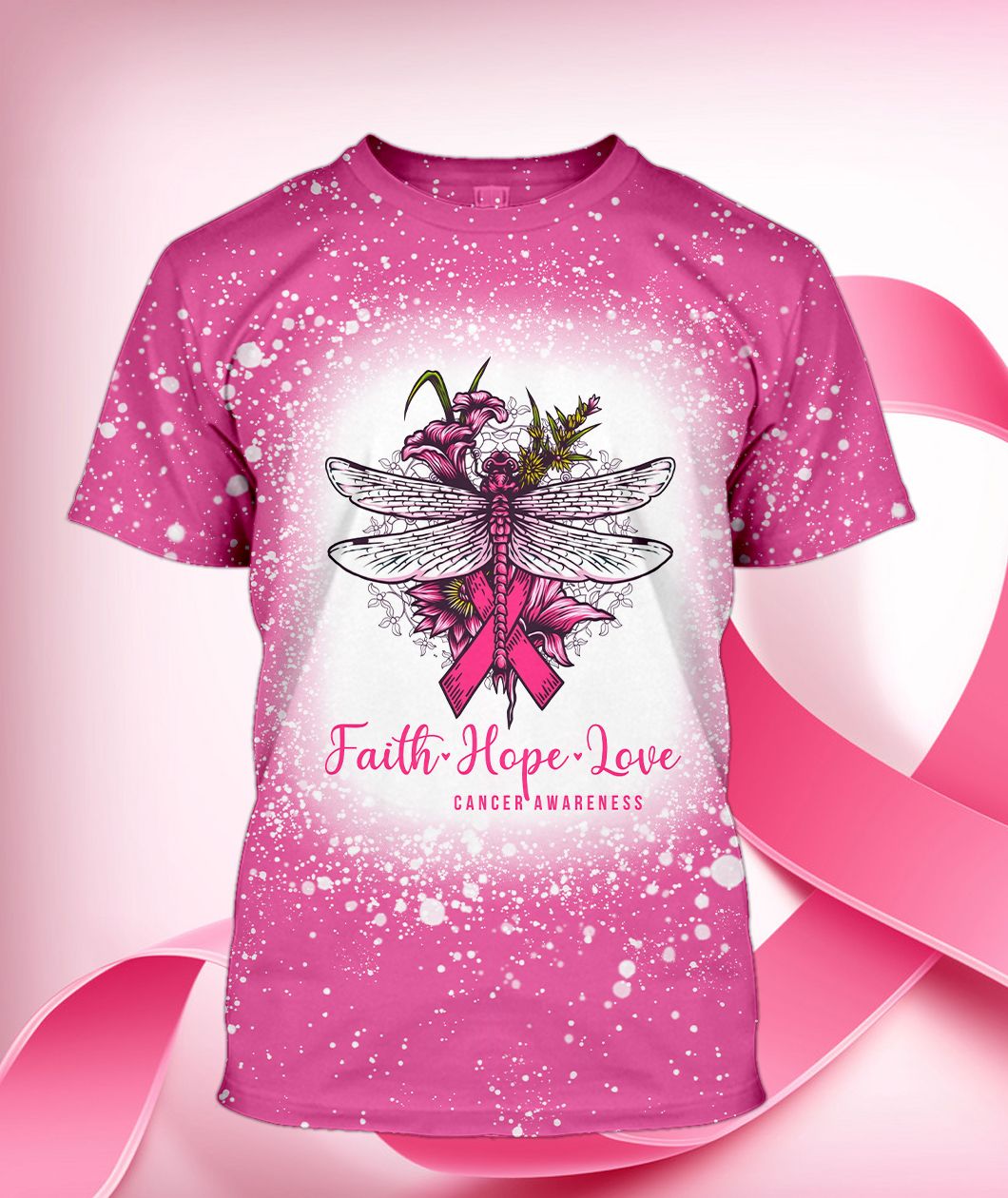 Gearhumans 3D Dragonfly Faith Hope Love Breast Cancer Awareness Custom Bleached Tshirt